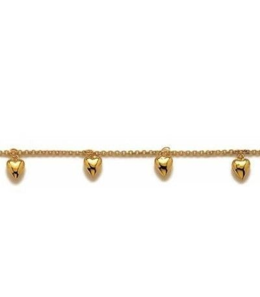 Chaîne de cheville plaqué or cinq microns d'or 750 millième breloques coeurs.